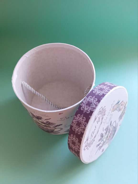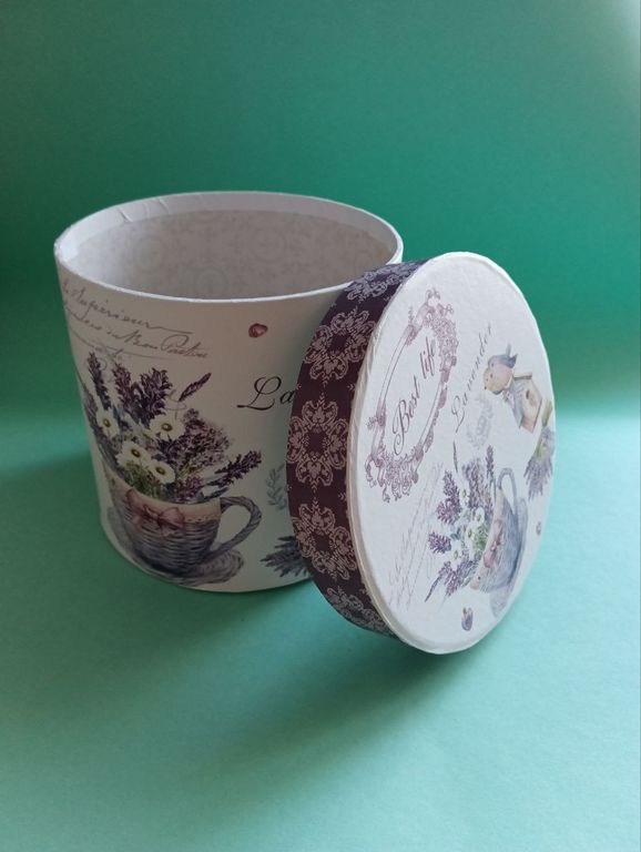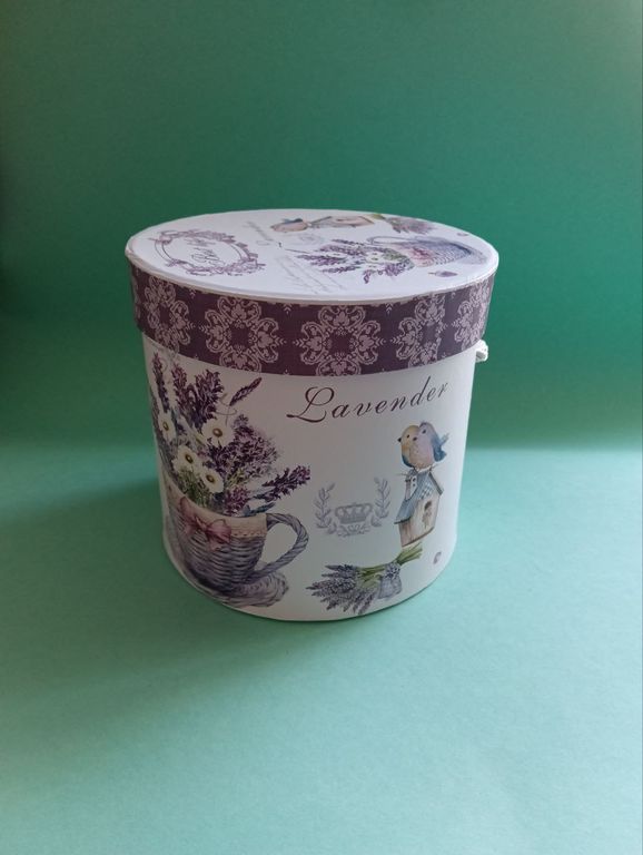 Коробки подарочные с мотивом лаванды с крученой ручной из веревки.