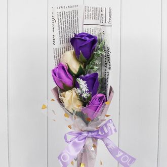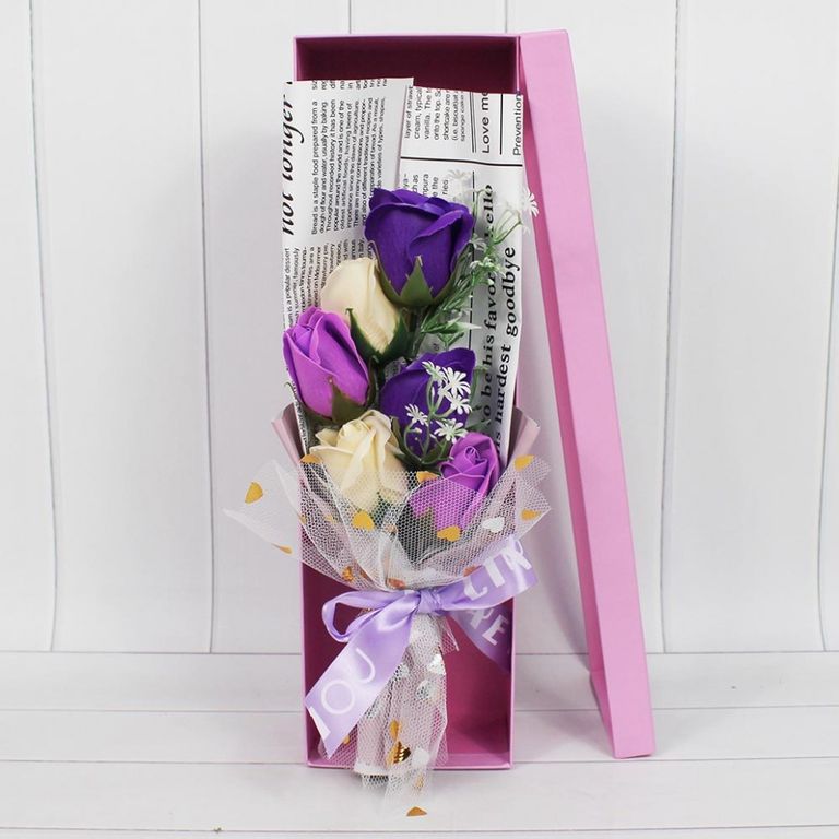 Набор из мыльных бутонов роз в подарочной упаковке в фиолетовом цвете.