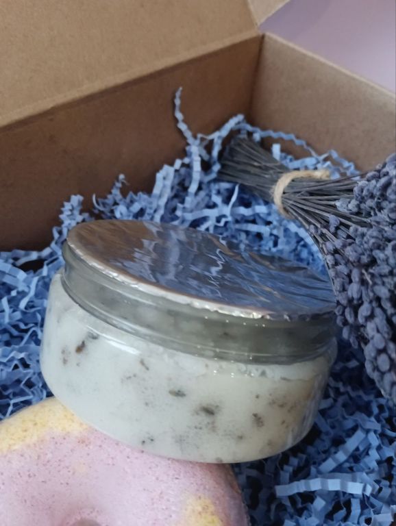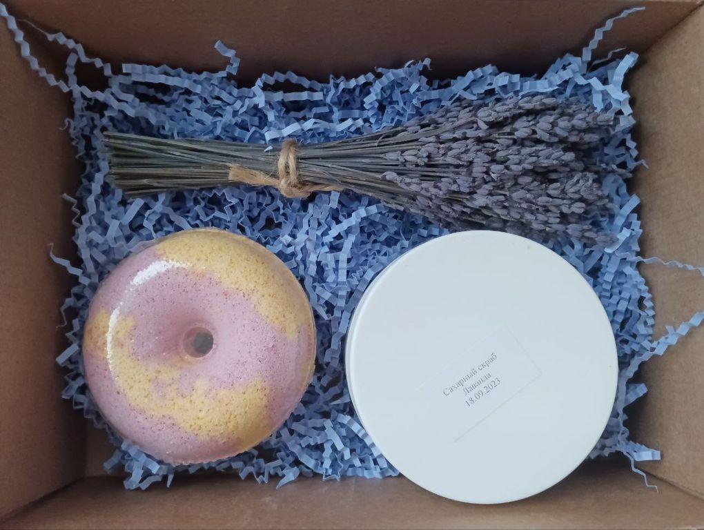 Подарочный набор из пончика для ванны, сахарного скраба и букетика лаванды.